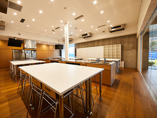 化学の実験は、理科実験室を使って「なぜそうなるのか」を検証。音楽の授業では、従来のグランドピアノがある音楽教室の隣の音楽スタジオを使って、プロさながらの演奏ができるよ。食堂の隣にあるKitchen Studioには、最新のキッチンが備わっていて調理実習も本格的に!