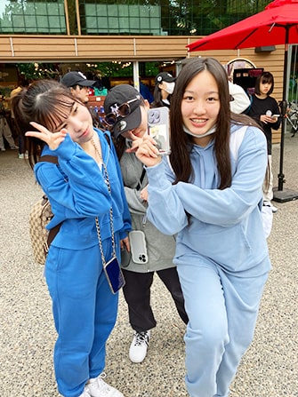 スタンレーパークのトーテンポール前で記念撮影、その後、グランビルビレッジにて昼食。