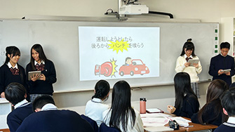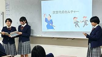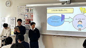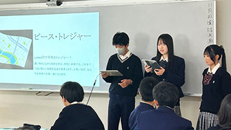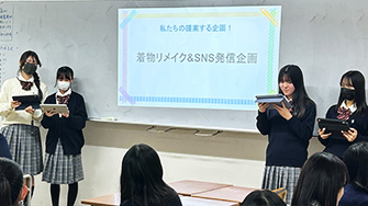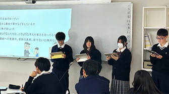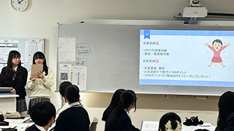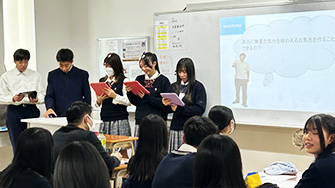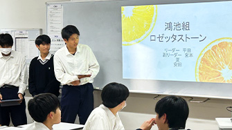 1年生の普通・特進コースでは、クエストエデュケーション(コーポレートアクセス)という教材を使用し、「企業探究」を行っています。実在する企業へのインターンシップを教室で体験し、働くことの意義や経済活動について学びながら、企業から与えられた課題(ミッション)にチームで取り組みます。